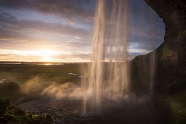 Da man hinter den Seljalandsfoss gehen kann, hatte man somit vor der Sonne einen wunderbar schimmernden Schleier aus Wasser. Für mich ist das einer der schönsten Wasserfälle Islands. Tags zwar