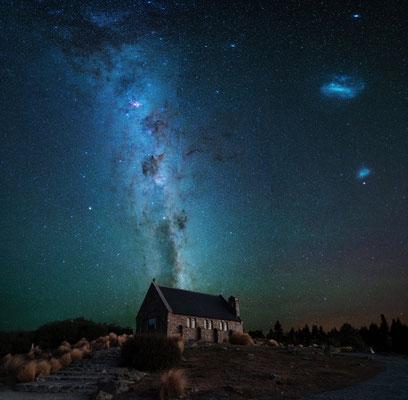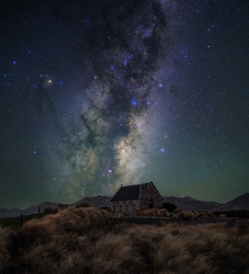 Ein besonders ikonischer Ort liegt aber am Rand des Dorfs Tekapo, nämlich die Church of the Good Shepherd direkt am Ufer dies Sees. Allerdings ist die so beliebt, dass sie tags wie nachts umlagert ist, nachts von zahlreichen Stirnlampenträgern, die es schwierig machen, ein Bild ohne störende Lichter im Vordergrund zu machen. Insbesondere das rote Licht der Stirnlampen, das ja eigentlich gut ist, weil ich die Nachtadaption der Augen nicht stört, sah nicht schön aus, wenn es die Kirche selbst bzw. die trockenen goldgelben Gräser rund um das Gotteshaus beleuchtet hat. In der zweiten Nachthälfte war der Betrieb dann aber deutlich weniger, so dass sich da Chancen ergaben, die zudem das Zentrum der Milchstraße mit im Bild haben.